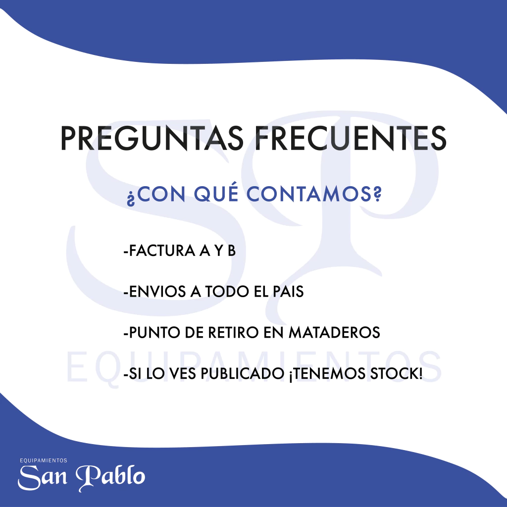 CARACTERÍSTICAS: *MATERIAL: A. INOXIDABLE *PARTES PLASTICAS: A.P.M. APROBADO POR SENASA *SISTEMA DE RODAMIENTOS BLINDADOS *CON DOBLE REGULADOR DE PRESIÓN ADMITE ALBONDIGAS, NUGGETS Y BASTONES DE MUZZARELA *MEDIDAS: 68CM X 32CM X 37CM DE ALTO *ANCHO PASO DE LA MILANESA 15CM *PESO: 14KG *MOTOR: MONOFÁSICO DE 1/4 HP *POTENCIA 0,18 Kw *CON FICHA INVERSORA PARA DESCARGA DE REBOZADOR *NO FORMA GRUMOS *PRODUCCION 40 / 50 KG H *7 KILOS DE REBOZADOR *PARA CARNE, POLLO, PESCADO Y VEGETALES GARANTIA DE FABRICA DE 6 MESES INDUSTRIA NACIONAL _______________________________________________________________________ EQUIPAMIENTOS SAN PABLO Realizamos Factura A o B (Aclarar condición frente al IVA al realizar la compra) Horarios de Atención: -Lunes a Viernes de 9:00 a 13:00 y de 14:30 a 17:00 Hs. Entregas Sin Cargo con Mercadoenvios En caso de necesitar el producto inmediatamente, puede retirarlo en nuestro local en la zona de Mataderos. También puede optar por entrega en moto a cargo del comprador..